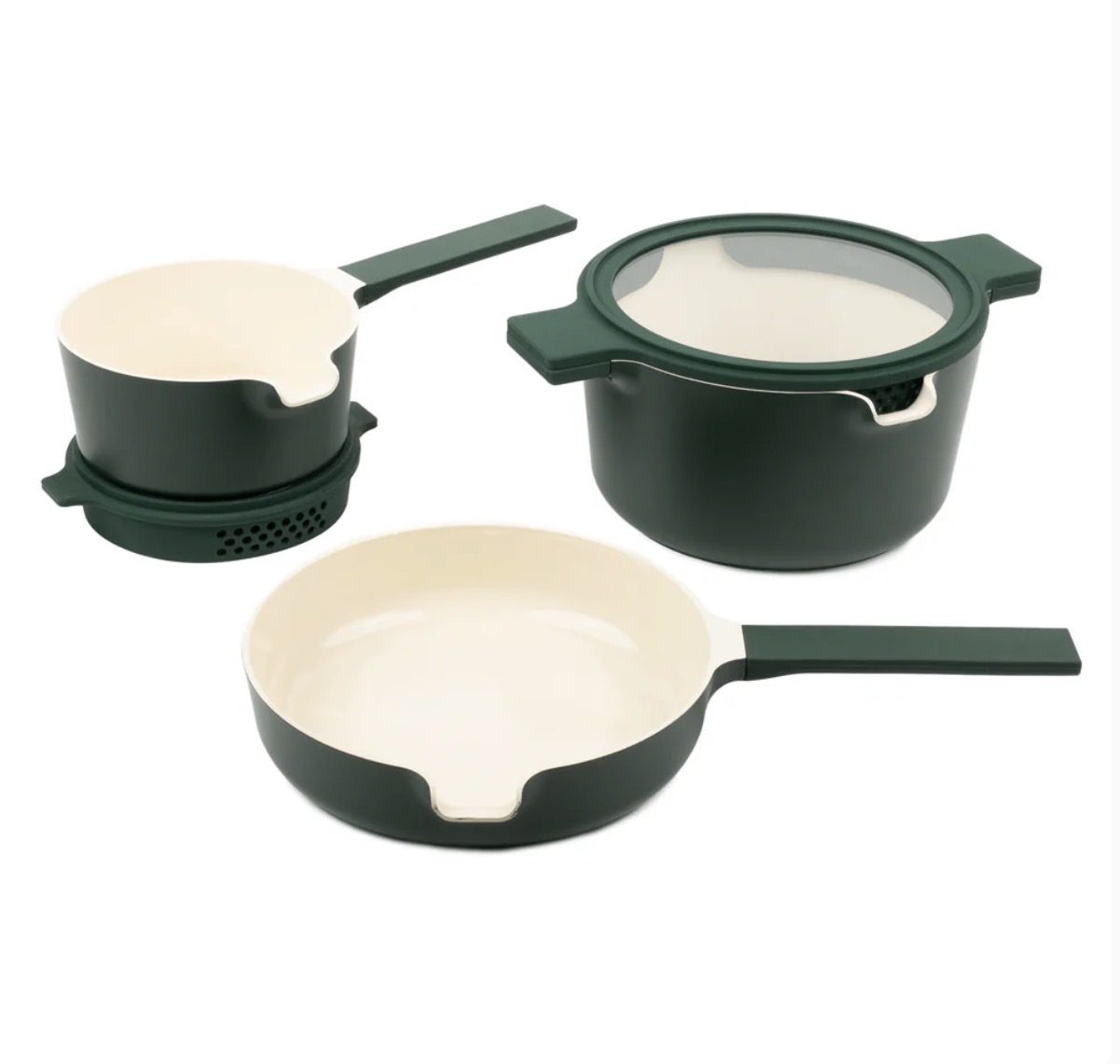 Bring order and joy to everyday cooking with this stylish 5-piece nesting cookware set designed for both function and aesthetics. Crafted with lightweight, recycled aluminum and a non-toxic ceramic coating, this set makes cooking and cleanup effortless while saving precious cabinet space.