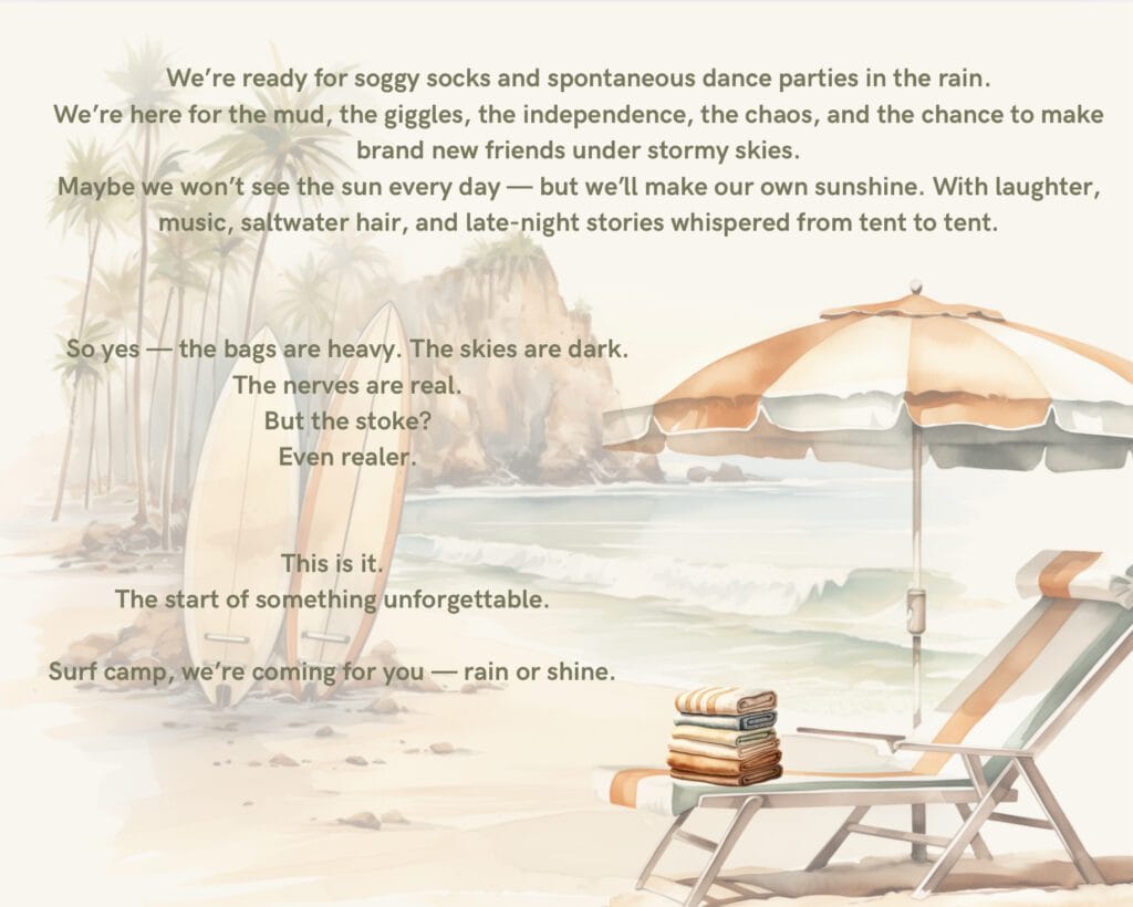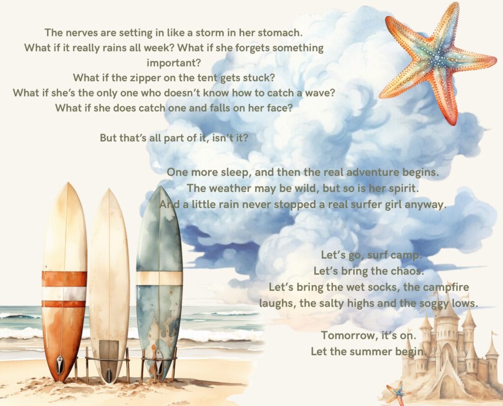 Three more sleeps. That’s all that’s left before Day zips up her boardbag, slips into her favorite bikini, and runs headfirst into her very first surf camp. Her first camp ever, actually. No parents. No familiar faces. Just a stretch of salty beach, crashing waves, and a week filled with sun-kissed freedom, fearless fun, and a whole lot of “first times.”
